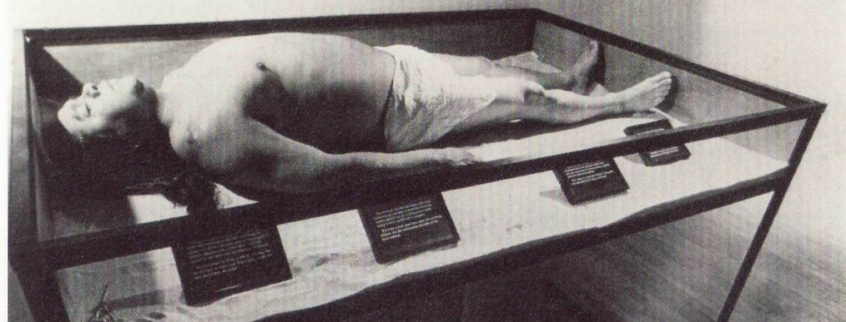 James luna, artifact piece, 1987.. He is lying in a museum vitrine, wearing a loincloth.